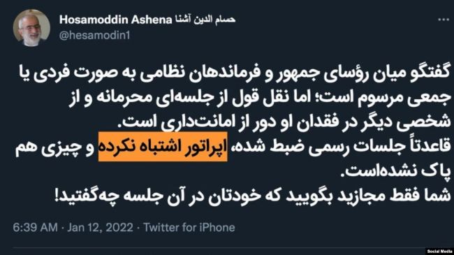تصویر توئیت حسامالدین آشنا که ساعاتی بعد آن را حذف کرد.رادیو فردا :حسامالدین آشنا، مشاور سابق رئیسجمهوری پیشین ایران، از اظهارات امیرعلی حاجیزاده فرمانده هوافضای سپاه در مصاحبه با روزنامه کیهان انتقاد کرده و خطاب به او گفته که «اپراتور اشتباه نکرده و چیزی هم پاک نشده است».واژه «اپراتور» ظاهرا اشاره به مامور شلیک موشکهای سپاه پاسداران به هواپیمای مسافربری اوکراینی دارد. پرواز پیاس ۷۵۲ هواپیمایی اوکراین بامداد ۱۸ دی سال ۹۸ بهفاصله کوتاهی پس از پرواز از فرودگاه بینالمللی تهران با شلیک دو موشک پدافند سپاه پاسداران سرنگون شد و تمامی ۱۷۶ سرنشین آن جان باختند.