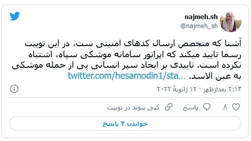 کاربر دیگری توئیت کرده است: «آشنا که متخصص ارسال کدهای امنیتی است، در این توئیت رسما تایید میکند که اپراتور سامانه موشکی سپاه اشتباه نکرده است. تاییدی بر ایجاد سپر انسانی پس از حمله موشکی به عینالاسد».