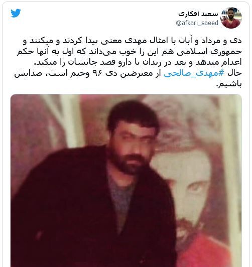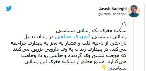 آقای صادقی در توییتر نوشت که مهدی صالحی روز سه‌شنبه۲۱ دی ماه به دلیل تزریق داروی اشتباه و همچنین تأخیر در اعزام وی به بیمارستانی خارج از زندان دچار سکته مغزی شد.