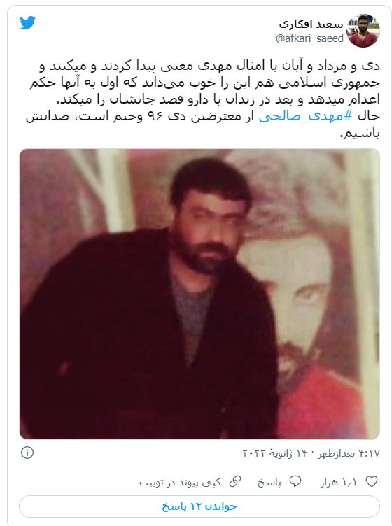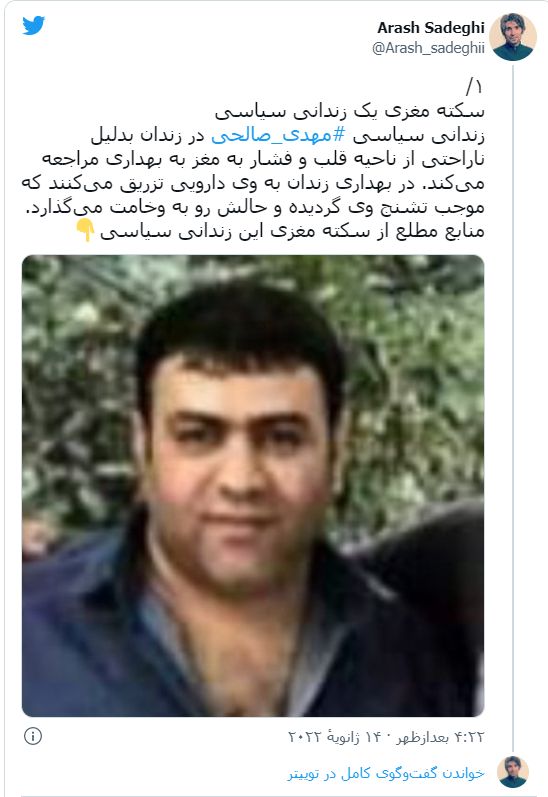 آقای صادقی در توییتر نوشت که مهدی صالحی روز سه‌شنبه۲۱ دی ماه به دلیل تزریق داروی اشتباه و همچنین تأخیر در اعزام وی به بیمارستانی خارج از زندان دچار سکته مغزی شد.