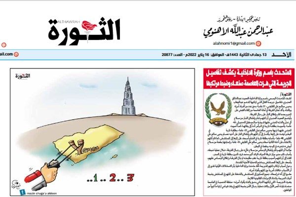 به گزارش گروه بینالملل خبرگزاری فارس، روزنامه «الثوره» یمن وابسته به صنعاء کاریکاتوری در اعتراض به ادامه تحرکات امارات عربی متحده در یمن منتشر کرد.در این کاریکاتور نشان داده شده که شمارش معکوس برای هدف گرفتن برج خلیفه از بلندترین برجهای جهان در امارات آغاز شده است.