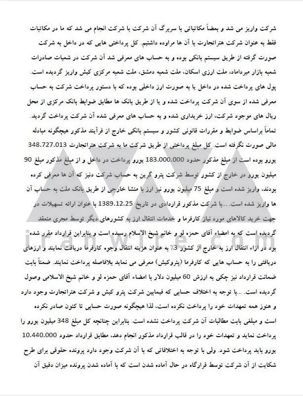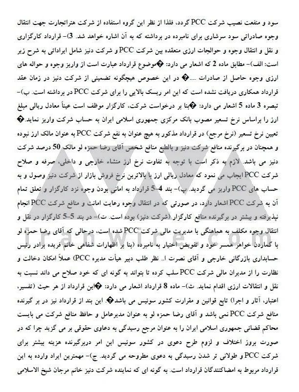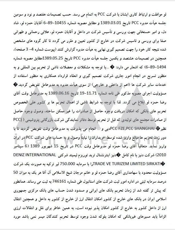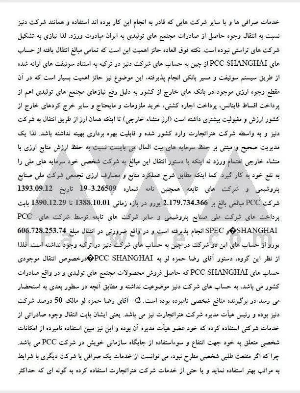 بهانه تحریمهادر بین اسناد حکم دادگاه، سخنان دو نفر از مدیران وقت شرکتهای مرتبط با شرکت بازرگانی پتروشیمی ایران نیز وجود دارد که نشان میدهد انتقال پول به حساب دنیز ترکیه صرفا برای تامین منافع شرکت حمزهلو و مرجان آلآقا بوده است.