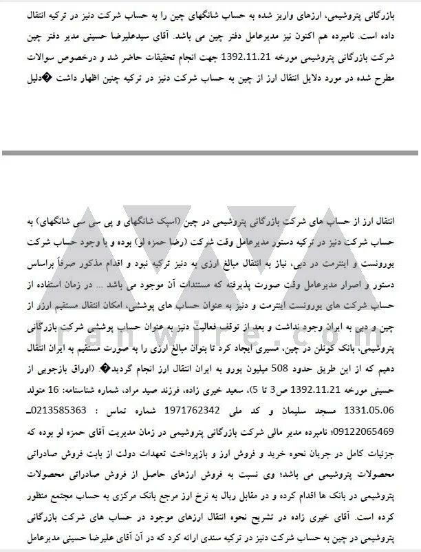 «سیدعلیرضا حسینی»، مدیر وقت دفتر چین شرکت بازرگانی پتروشیمی در جریان تحقیقات همین پرونده در مورد دلایل انتقال ارز از چین به حساب شرکت دنیز در ترکیه گفته است: «دلیل انتقال ارز از حسابهای شرکت بازرگانی پتروشیمی در چین (اسپک شانگهای و پیسیسی شانگهای) به حساب شرکت دنیز در ترکیه دستور مدیرعامل وقت شرکت، رضا حمزهلو بوده و با وجود حساب شرکت یورونست و اینترمت در دبی نیاز به انتقال مبالغ ارزی به دنیز ترکیه نبود و اقدام مذکور صرفا براساس دستور و اصرار مدیرعامل وقت صورت پذیرفته که مستنداتش موجود میباشد.»
