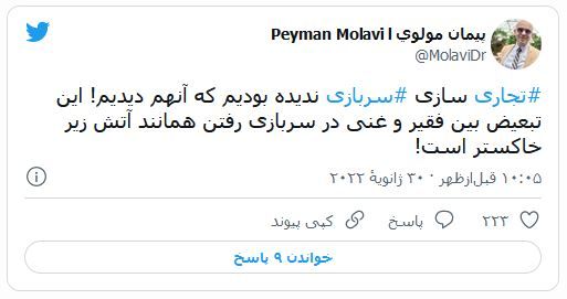 در همین خصوص و در واکنش به اظهارات دیروز سخنگوی کمیسیون تلفیق لایحه بودجه، یکی کاربر در توییتر نوشت: "قبلا سربازی برای همه اجباری بود، الان فقط برای فقرا اجباری است".