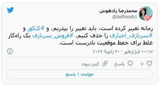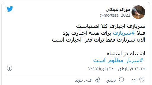 یک کاربر به نام محمدرضا در توییتر نوشت که سربازی اجباری و کنکور باید حذف شوند و نوشت: "فروش سربازی یک راه‌کار غلط برای حفظ یک موقعیت نادرست است."