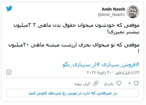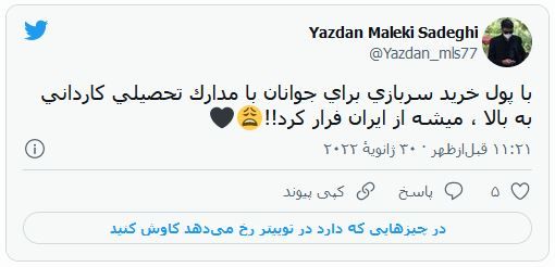 کاربری به نام یزدان نوشت: "با پول خرید سربازی برای جوانان با مدرک تحصیلی کاردانی به بالا، می‌شود از ایران فرار کرد."