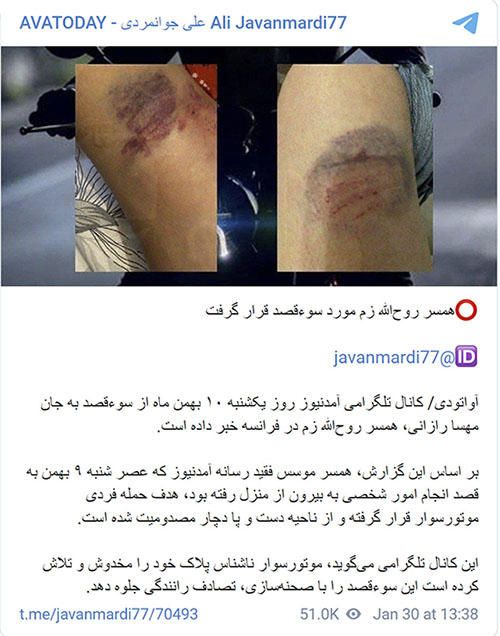 ایران وایر :بر اساس گزارشها، مهسا رازانی، همسر روحالله زم در فرانسه مورد حمله فردی ناشناس قرار گرفته و مجروح شده است.گزارش شده که خانم رازانی در روز یکشنبه ۱۰ بهمن توسط فردی ناشناس که سوار بر یک دستگاه موتور سیکلت بوده هدف سوءقصد قرار گرفته و از ناحیه دست و پا به شدت مجروح شده است.