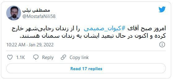 روز شنبه (۹ بهمن)، مصطفی نیلی، وکیل مدافع کیوان صمیمی، روزنامهنگار زندانی، در توییتی از خارج کردن این روزنامهنگار از زندان رجاییشهر و تبعید به زندان سمنان نوشت. پیش از این انتقال، کیوان صمیمی از اوین به رجاییشهر و بالعکس منتقل شده بود.