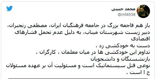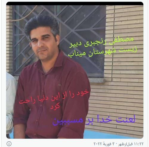 مصطفی رنجبران، معلم ساکن میناب که خودکشی کردرادیو فردا :مصطفی رنجبران، معلم ساکن شهرستان میناب در استان هرمزگان، «به دلیل مشکلات اقتصادی و معیشتی» خودکشی کرد و جان خود را از دست داد.محمد حبیبی، عضو و سخنگوی هیئت مدیره کانون صنفی معلمان تهران، روز پنجشنبه، ۱۴ بهمن در توییتی ضمن اعلام این خبر «تداوم این خودکشیها در میان معلمان، کارگران، بازنشستگان و دانشجویان» را «نوعی قتل سیستماتیک» خوانده و «مسئولیت آن را بر عهده مسئولان جمهوری اسلامی» دانست.