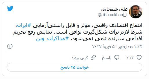 دریابان شمخانی، پیش از نشان دادن واکنش منفی به اقدام اخیر آمریکا در صدور معافیت از تحریم برای برخی از برنامه های اتمی ایران در توییتر خود نوشته بود "حق ایران برای ادامه تحقیق و توسعه و حفظ توانمندیها و دستاوردهای صلحآمیز هستهای در کنار تامین امنیت آن در برابر شرارتهای حمایت شده با هیچ توافقی قابل محدود شدن نیست".