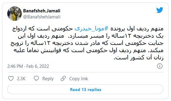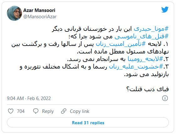 بنفشه جمالی روزنامهنگار و فعال حقوق زنان در توییترش متهم ردیف اول پرونده قتل مونا حیدری را حکومتی دانسته که اینگونه قتلها را مجاز میشمارد.