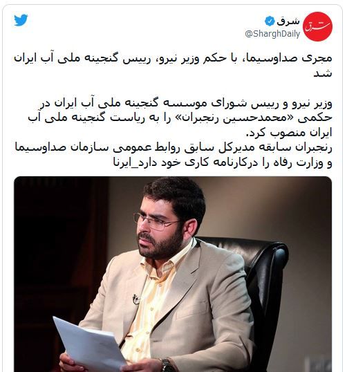 محمدحسین رنجبرانرادیو فردا :رسانههای ایران روز چهارشنبه ۲۰ بهمنماه گزارش دادند که علیاکبر محرابیان، وزیر نیرو و رئیس شورای موسسه گنجینه ملی آب ایران، در حکمی محمدحسین رنجبران، مجری تلویزیونی، را به ریاست مؤسسه «گنجینه ملی آب ایران» منصوب کرد.در کارنامه محمدحسین رنجبران پیشینهای مربوط به امور آب یا سازههای آبی دیده نمیشود و او سردبیری و تهیهکنندگی و اجرای چند برنامه گفتوگومحور در رادیو و تلویزیون حکومتی را برعهده داشته است.