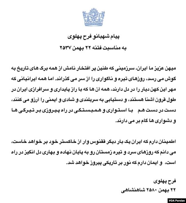 شهبانو فرح پهلویصدای آمریکا :شهبانو فرح پهلوی همسر شاه پیشین ایران در آستانه چهل و سومین سالگرد انقلاب اسلامی در ایران پیامی صادر کرد و در آن، انقلاب ۵۷ را «فتنه ۲۲ بهمن» نامید.براساس نسخهای از پیام که در اختیار صدای آمریکا قرار گرفت، شهبانو فرح پهلوی با اشاره به اینکه ایران «روزهای تیره و ناگواری را از سر می گذراند»، گفته است: «همه ایرانیانی که مهر این کهن دیار را در دل دارند، همه آن ها که با راز پایداری و سرافرازی ایران در طول قرون آشنا هستند، و دستیابی به سربلندی و شادی و ایمنی را آرزو می کنند، دست در دست هم با استواری و همبستگی در راه پیروزی بر تیرگی ها و دشواری ها گام بر می دارند.»