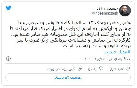 حسین رزاق نیز میگوید وقتی قانون اجازه ازدواج با کودک ۱۲ ساله را کاملا «قانونی و شرعی» میداند، اجازه این «قتل سبوعانه» هم از پیش صادر شده است و «کارگردان این نمایش وحشیانه مردانگی و پُز غیرت با سر بریده، قانون و سنت زنستیز است.»