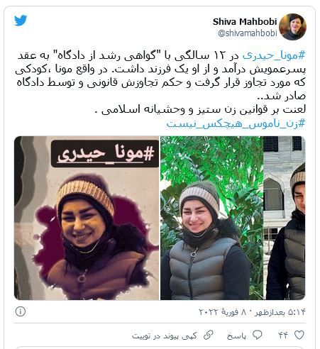 شیوا محبوبی، سخنگوی کمیته مبارزه برای آزادی زندانیان سیاسی نیز با انتشار متنی در توئیتر خود میگوید مونا حیدری کودکی است که «مورد تجاوز قرار گرفت و حکم تجاوزش قانونی و توسط دادگاه صادر شد.»