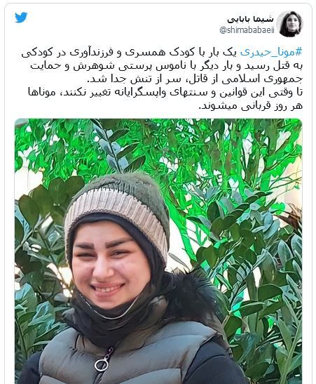 شیما بابایی، فعال حقوق بشر ایرانی در بلژیک نیز که میگوید مونا حیدری یک بار با کودک همسری و فرزندآوری در کودکی به قتل رسید و بار دیگر با ناموس پرستی شوهرش و حمایت جمهوری اسلامی از قاتل، سر از تنش جدا شد در توئیتر خود با انتشار عکسی از این کودکهمسر نوشت «تا وقتی این قوانین و سنتهای واپسگرایانه تغییر نکنند، موناها هر روز قربانی میشوند.»