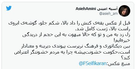 آسیه امینی، روزنامهنگار و تحلیلگر مسائل اجتماعی زنان، در توئیتر نوشت: «بین دیکتاتوری و فرهنگ نرپرست پیوندی دیرینه و معنادار است، حکومت خشونتپیشه چرا به مردم خشونتگر اعتراض کند؟»