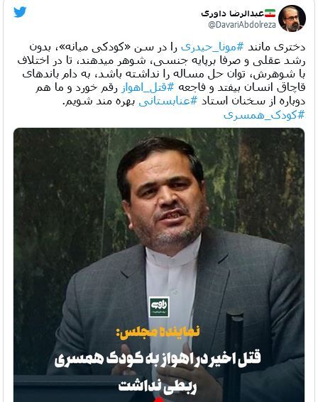 عبدالرضا داوری، پژوهشگر اقتصاد سیاسی، نیز در حساب کاربری خود در توئیتر نوشت: «دختری مانند مونا حیدری را در سن «کودکی میانه»، بدون رشد عقلی و صرفا برپایه جنسی، شوهر میدهند، تا در اختلاف با شوهرش، توان حل مساله را نداشته باشد، به دام باندهای قاچاق انسان بیافتد و فاجعه قتل اهواز رقم بخورد و ما هم دوباره از سخنان استاد عنابستانی بهرهمند شویم.»
