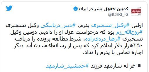 غزاله شارمهد دختر جمشید شارمهد، شهروند ایرانی -آلمانی و رئیس رادیو تندر گفته رضا دردیزاده، دومین وکیل تسخیری به شرطی پرونده پدرش را بررسی خواهد کرد که در ازای آن ۲۵۰ هزار دلار دریافت کند.خانم شارمهد گفته است اولین وکیل تسخیری پدرش، دبیر دریابیگی بود که وکالت تسخیری روحالله زم را هم برعهده داشت. اما خانواده آقای شارمهد بعدا خواستار عزل او شدند.