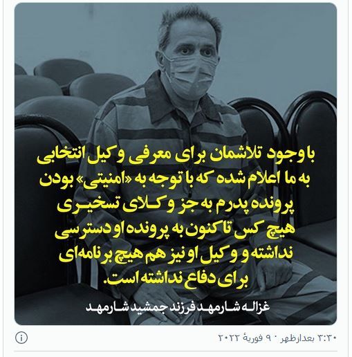 غزاله شارمهد در توضیح اولین دادگاه پدرش نوشت: "از تاریخ دادگاه اطلاعی نداشتیم. کنسولگری آلمان هم در این مورد مطلع نشده است. این محاکمه ساختگی است". آقای شارمند شهروند آلمان هم هست ولی در سالهای اخیر به آمریکا مهاجرت کرده بود.
