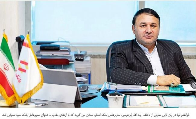 معاون اقتصادی سپاه از «آیتالله ابراهیمی»، مدیرعامل بانک انصار، نام میبرد و میگوید که «ابراهیمی رفته در تیم آبرومند، چون میترسد که ادامه این ماجرا [رسیدگی به فساد] به بانک انصار هم کشیده شود.»