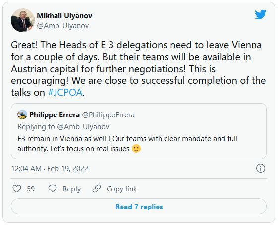 او نوشت: «عالی! رؤسای هیأت‌های E3 (آلمان، فرانسه و بریتانیا) باید برای چند روز وین را ترک کنند اما تیم‌های آنها برای مذاکرات بیشتر در پایتخت اتریش در دسترس خواهند بود! این دلگرم‌کننده است! ما به تکمیل موفقیت‌آمیز مذاکرات درباره برجام نزدیک می‌شویم.»