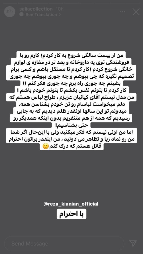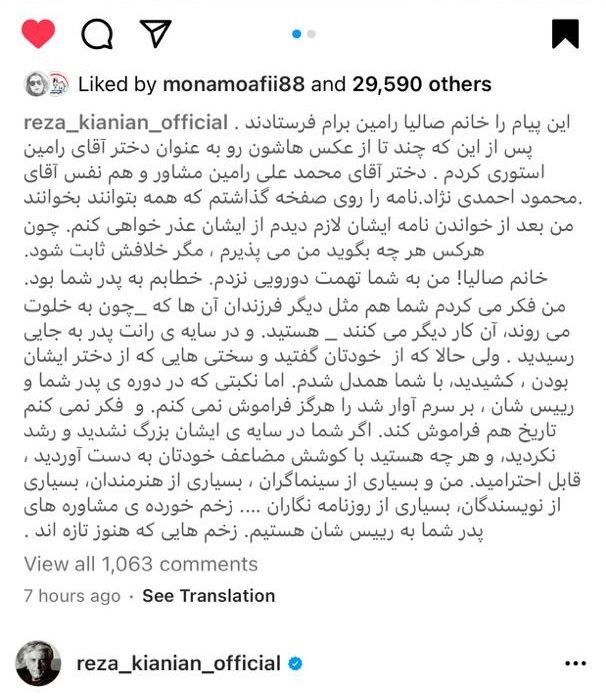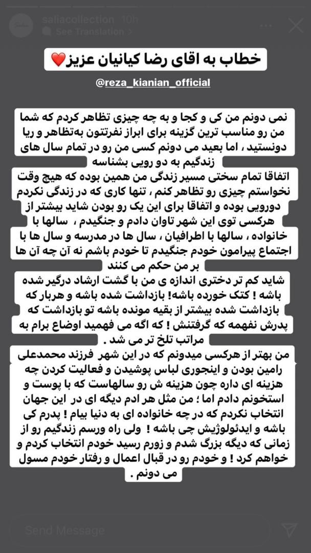 به گزارش دیده بان ایران؛ به دنبال انتقاد «رضا کیانیان» از دختر «محمدعلی رامین» مشاور مطبوعاتی محمود احمدینژاد و معاون مطبوعاتی و اطلاعرسانی وزارت فرهنگ و ارشاد اسلامی در دولت های نهم و دهم، که در عرصه مُد فعالیت می کند؛ صالحه رامین با انتشار مطلبی ضمن تبری جستن از افکار و ایدوئولوژی پدرش نسبت به انتقاد این بازیگر پیشکسوت سینما واکنش نشان داد و نوشت: " من سعی کرده ام هیچ وقت تظاهر به چیزی نکنم که می دانم که در این شهر فرزند محمدعلی رامین بودن و اینگونه لباس پوشیدن چه هزینه ای دارد و من هم طی این سالها هزینه اش را داده ام."صالحه رامین در ادامه توضیحات خود خطاب به رضا کیانیان نوشت: "شاید کمتر دختری اندازه من با گشت ارشاد درگیر شده باشد، کتک خورده باشد و بازداشت شده باشد. و سعی کرده باشد پدرش نفهیمده باشد که اگر می فهمید اوضاع تلخ تر می شد."