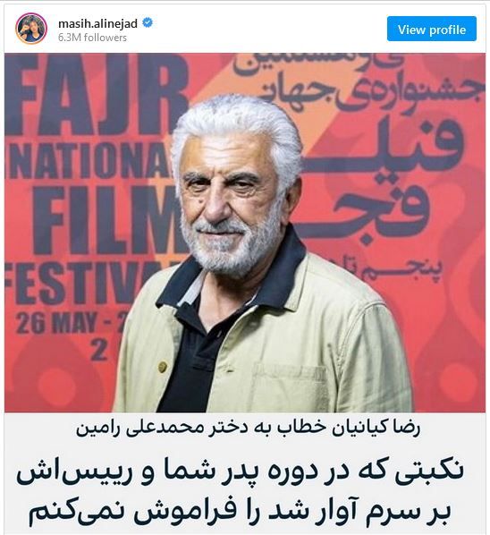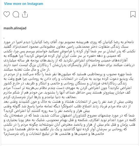 کانال اینستاگرام مسیح علی نژاد:نامهام به رضا کیانیان که روزی هنرپیشه محبوبم بود. آقای رضا کیانیان! دیدم اخیرا در مورد سبک زندگی متفاوت دختر محمدعلی رامین معاون مطبوعاتی محمود احمدینژاد گفتید نکبتی که پدر ایشان بر سر شما آوار کرده را فراموش نمیکنید خواستم بپرسم پس چرا، نکبتی که خمینی و دهه «فجر» بر سر ملت ایران آوار کرده فراموش کردید؟ چرا هیچگاه به آقازادههای خمینی وخامنهای اعتراض نکردید که از ردیفهای بودجه هر ساله میلیاردی دریافت میکنند برای حفظ نشر و آثار واپسگرای پدرانشان ؟ ریاکاران بزرگِ لیست امید دارند از جان و مال ملت تغذیه میکنند.