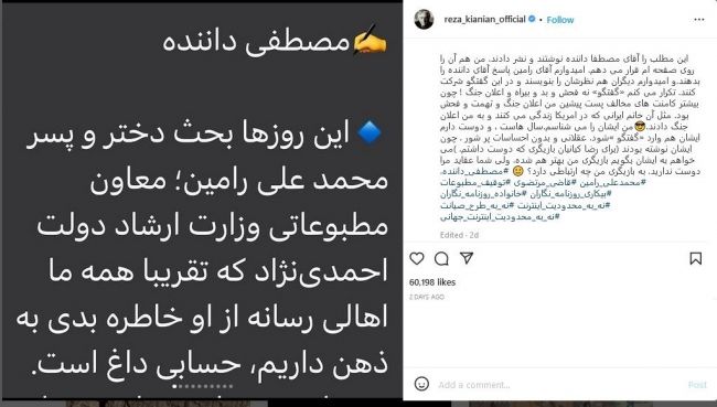 رضا کیانیان در صفحه اینستاگرام خود نوشت:این مطلب را آقای مصطفی داننده نوشتند و نشر دادند. من هم آن را روی صفحه ام قرار می دهم. امیدوارم آقای رامین پاسخ آقای داننده را بدهند.و امیدوارم دیگران هم نظرشان را بنویسند و در این گفتگو شرکت کنند. تکرار می کنم «گفتگو» نه فحش و بد و بیراه و اعلان جنگ ! چون بیشتر کامنت های مخالف پست پیشین من اعلان جنگ و تهمت و فحش بود. مثل آن خانم ایرانی که در امریکا زندگی می کنند و به من اعلان جنگ دادند.