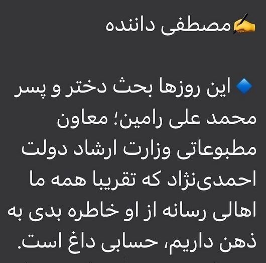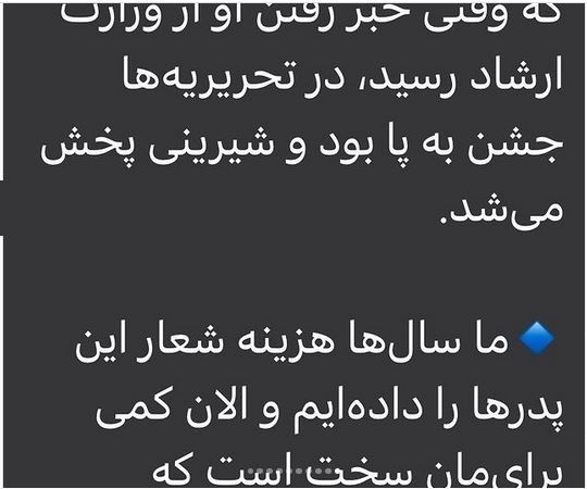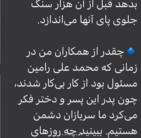 چقدر از همکاران من در زمانی که محمد علی رامین مسئول بود از کار بیکار شدند، چون پدر این پسر و دختر فکر میکرد ما سربازان دشمن هستیم. ببینید چه روزهای سختی با رامین سپری شده بود که وقتی خبر رفتن او از وزارت ارشاد رسید، در تحریریهها جشن به پا بود و شیرینی پخش میشد.