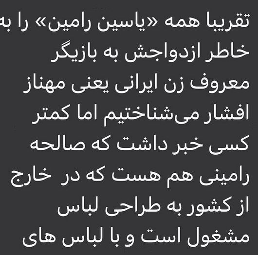 این روزها بحث دختر و پسر محمد علی رامین؛ معاون مطبوعاتی وزارت ارشاد دولت احمدینژاد که تقریبا همه ما اهالی رسانه از او خاطره بدی به ذهن داریم، حسابی داغ است. تقریبا همه «یاسین رامین» را به خاطر ازدواجش به بازیگر معروف زن ایرانی یعنی مهناز افشار میشناختیم اما کمتر کسی خبر داشت که #صالحه_رامین هم هست که در خارج از کشور به طراحی لباس مشغول است و با لباس های طراحی شده اش نیز عکس می گیرد و منتشر می کند.