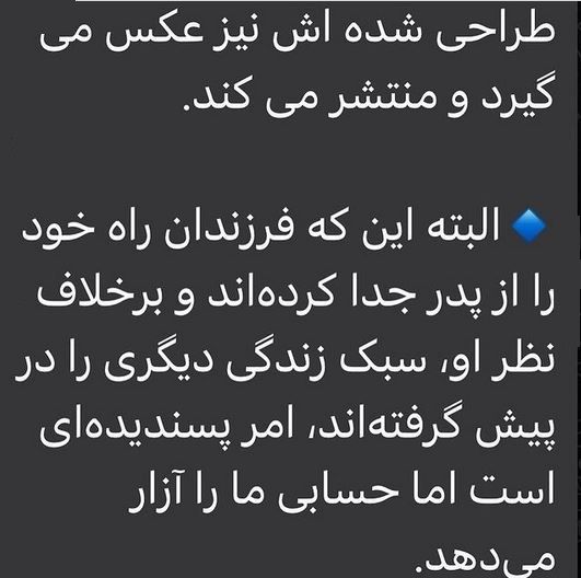 البته این که فرزندان راه خود را از پدر جدا کردهاند و برخلاف نظر او، سبک زندگی دیگری را در پیش گرفتهاند، امر پسندیدهای است اما حسابی ما را آزار میدهد.
