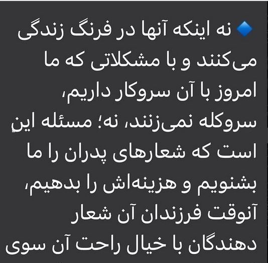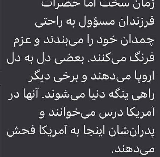 نه اینکه آنها در فرنگ زندگی میکنند و با مشکلاتی که ما امروز با آن سروکار داریم، سروکله نمیزنند، نه؛ مسئله این است که شعارهای پدران را ما بشنویم و هزینهاش را بدهیم، آنوقت فرزندان آن شعار دهندگان با خیال راحت آن سوی آبها، درس بخوانند، زندگی کنند و بعد عکس هم بگذارند.