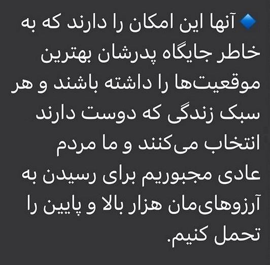 آنها این امکان را دارند که به خاطر جایگاه پدرشان بهترین موقعیتها را داشته باشند و هر سبک زندگی که دوست دارند انتخاب میکنند و ما مردم عادی مجبوریم برای رسیدن به آرزوهایمان هزار بالا و پایین را تحمل کنیم.