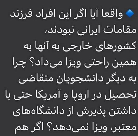 واقعا آیا اگر این افراد فرزند مقامات ایرانی نبودند، کشورهای خارجی به آنها به همین راحتی ویزا میداد؟ چرا به دیگر دانشجویان متقاضی تحصیل در اروپا و آمریکا حتی با داشتن پذیرش از دانشگاههای معتبر، ویزا نمیدهد؟ اگر هم بدهد قبل از آن هزار سنگ جلوی پای آنها میاندازد.