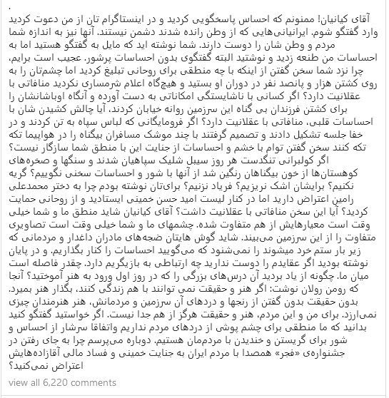 آقای کیانیان! ممنونم که احساس پاسخگویی کردید و در اینستاگرام تان از من دعوت کردید وارد گفتگو شوم. ایرانیانیهایی که از وطن رانده شدند دشمن نیستند. آنها نیز به اندازه شما مردم و وطن شان را دوست دارند. شما نوشته اید که مایل به گفتگو هستید اما به احساسات من طنعه زدید و نوشتید البته گفتگوی بدون احساسات پرشور. عجیب است برایم، چرا نزد شما سخن گفتن از اینکه با چه منطقی برای روحانی تبلیغ کردید اما چشمتان را به روی کشتن هزار و پانصد نفر در دوران او بستید و هیچگاه اعلام شرمساری نکردید منافاتی با عقلانیت دارد؟ اگر کسانی با ناشایستگی امکاناتی به دست آورده و آنگاه اوباشانشان را برای کشتن فرزندان بی گناه این سرزمین روانه خیابان کردند، آیا چالش کشیدن شان با احساسات قلبی، منافاتی با عقلانیت دارد؟