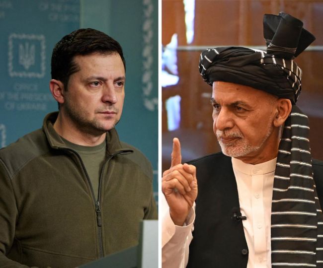 انتشار ویدیوهای ولادیمیر زلنسکی از کییف درحالیکه از ایستادگی در مقابل روسها حرف میزند و به سربازان کشورش درود میفرستد باعث شد تا افغانها نیز به یاد فرار اشرف غنی و سقوط افغانستان به دست طالبان بیفتند. در پانزدهم اوت سال گذشته، هنگامیکه طالبان به اطراف شهر کابل رسید و پایتخت را محاصره کرد، هزاران نیروی نظامی در کابل و شماری دیگر از شهرها آماده نبرد با طالبان بودند و هزاران نیروی خارجی نیز در فرودگاه کابل حضور داشتند. شب چهاردهم اوت، اشرف غنی با آنتونی بلینکن، وزیر خارجه آمریکا تلفنی صحبت کرد و به او گفت تا آخرین گلوله در مقابل طالبان میجنگد و از سقوط افغانستان به دست این گروه جلوگیری میکند. او روزهای قبل از آن هم در سخنرانیهایش به مردم افغانستان اطمینان داده بود که یا با طالبان مذاکره میکند یا کنار آنان در میدان جنگ علیه طالبان میماند.