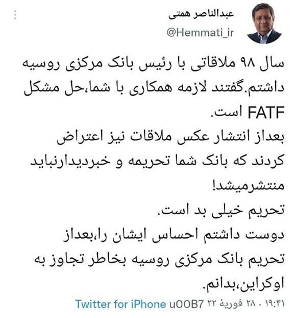 عبدالناصر همتی رئیس کل اسبق بانک مرکزی در توئیتی با اشاره به ملاقات با رئیس بانک مرکزی روسیه در سال ۹۸ نوشت: تحریم خیلی بد است. دوست داشتم احساس ایشان را، بعداز تحریم بانک مرکزی روسیه بخاطر تجاوز به اوکراین، بدانم.همتی در توئیتی در این باره نوشت: سال ٩٨ ملاقاتی با رئیس بانک مرکزی روسیه داشتم. گفتند لازمه همکاری با شما، حل مشکل FATF است.