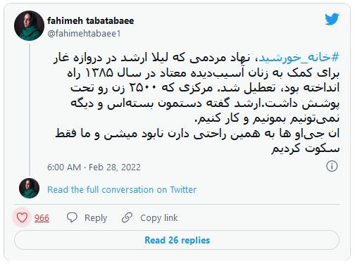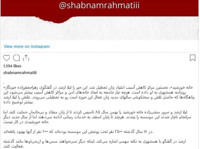تصویری از اعضای خورشیدیورونیوز:بنیانگذاران «خانه خورشید»، نخستین مرکز کاهش آسیب اعتیاد زنان در ایران، در برابر فشارها و به اجبار تن به تعطیلی این سازمان مردمنهاد دادند.لیلا ارشد و سرور منشیزاده این مرکز را در بهمن ماه ۱۳۸۵ تأسیس کرده بودند تا از زنان معتاد و بیخانمان حمایت کنند، اما سرانجام ناچار شدند آن را ببندند. این خبر را لیلا ارشد، در گفتگویی با جعفرزاده، خبرنگار روزنامه همشهری اعلام کرد.