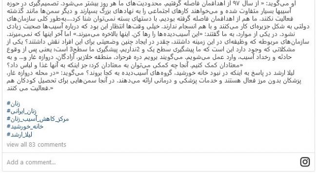 او درباره فشارهایی که منجر به فعالیت آنها شد، میگوید: «از سال ۹۷ از اهدافمان فاصله گرفتیم. محدودیتهای ما هر روز بیشتر میشود. تصمیمگیری در حوزه آسیبها بسیار متفاوت شده و میخواهند کارهای اجتماعی را به نهادهای بزرگ بسپارند و دیگر سمنها مانند گذشته فعالیت نکنند. ما هم از اهدافمان فاصله گرفته بودیم.»او همچنین باز هم بدون اشاره به سازمان یا مسئول خاصی گفت: «به ما گفتند این آسیبدیدهها را رها کن. اینها بالاخره میمیرند. اما آخر اینها که نمیمیرند. سازمانهای مربوطه که وظیفهای در این زمینه داشتند، چقدر در ایجاد چنین وضعیتی برای این افراد نقش داشتند؟ یکی از مشکلاتی که وجود دارد این است که ما پیشگیری سطح یک و ۲ نداریم، پیشگیری ما سطح ۳ است؛ یعنی پس از وقوع حادثه و رخداد آسیب، وارد عمل میشویم. میگویند برویم دره فرحزاد، منطقه خلازیر، آزادگان، دروازه غار و... و به معتادان کمک کنیم. آنجا چه کمکی میتوان به معتادان کرد جز اینکه به آنها غذا و لباس داد؟»