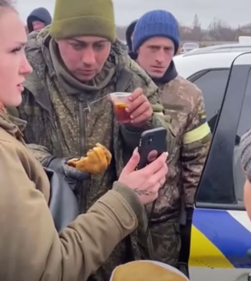 یک کلیپ منتشر شده در شبکههای اجتماعی نشان میدهد که یک سرباز ارتش روسیه اسیر شده توسط اوکراینیها در حالی که به او اجازه داده شده بود با مادرش تماس بگیرد توسط ساکنان محلی در حال پذیرایی است.