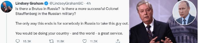 در این توییت، گراهام میپرسد: «آیا سرهنگی در ارتش روسیه پیدا نمیشود که خواهان قتل پوتین باشد، مانند کلاوس فون اشتافنبرگ آلمانی، که نزدیک بود هیتلر را بکشد ولی موفق نشد. آیا در میان روسها «بروتوس» دیگری برای خلاصی روسیه از شر پوتین وجود دارد؟»