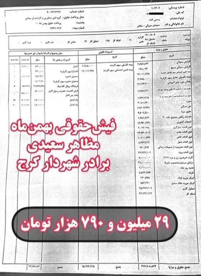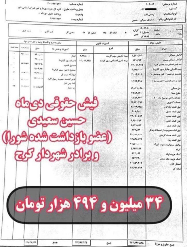 همچنین طبق اسناد منتشر شده حسین سعیدی برادر شهردار کرج که توسط نهادهای امنیتی بازداشت و از شورای شهر برکنار شده بود در دی ماه ۳۴ میلیون دریافتی داشته است!
