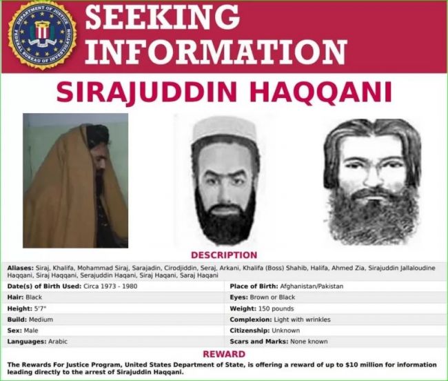 سایت پلیس فدرال آمریکا سراج الدین حقانی را به عنوان "بالاترین تحت تعقیب" نام برده و برای اطلاعاتی که منجر به دستگیری او شود، جایزه ۱۰ میلیون دلاری را اعلام کرده است.این اقدام در حالی صورت گرفته است که استخبارات طالبان که تحت کنترل شبکه حقانی است، شماری از زنان فعال و معترض در کابل را بازداشت کرده است.