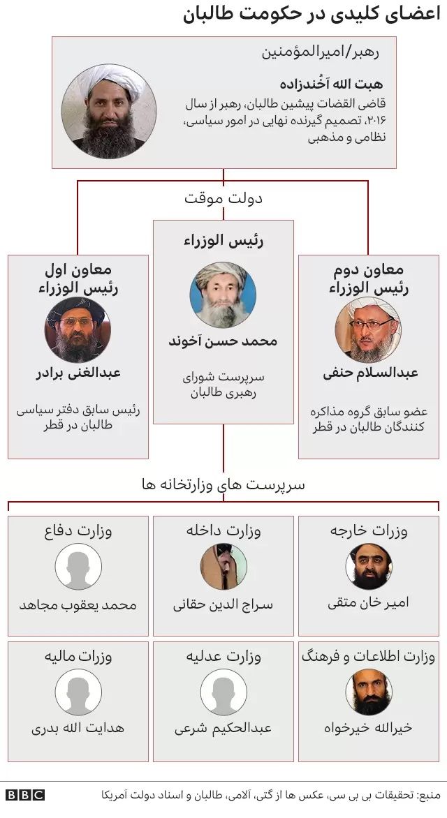 دستکم ۵ عضو کابینه طالبان از فرماندهان مهم شبکه حقانی هستند. اما طالبان می‌گوید شبکه حقانی بخشی از "امارت اسلامی" است و "نام و تشکیلات جداگانه‌ای ندارند".