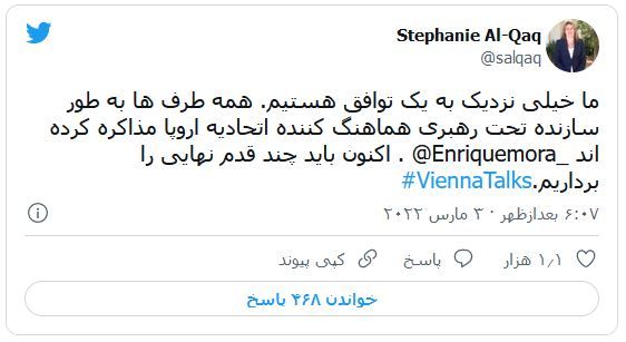 استفانی القاق، نماینده بریتانیا در مذاکرات وین نیز روز گذشته، در توییتی به زبان فارسی نوشت: «ما خیلی نزدیک به یک توافق هستیم. همه طرفها به طور سازنده تحت رهبری انریکه مورا، هماهنگ کننده اتحادیه اروپا، مذاکره کردهاند.»