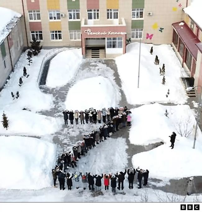 در مرکز شهر کازان روسیه، شصت نفر از بچهها و کارمندان یک نوانخانه به حیاط موسسهشان رفتند و میان برف در حالی که حرف "Z" را ساخته بودند، عکس گرفتند.