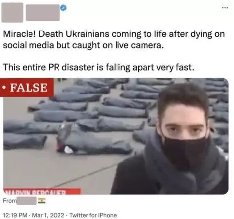در متن توییت که تصویرش در زیر آمده نوشته شده: "معجزه! کشته‌شده‌های اوکراینی بعد از آنکه در شبکه‌های مجازی می‌میرند زنده می‌شوند اما دوربین زنده این صحنه را شکار کرده است. این فاجعه تقلبی رسانه‌های عمومی به‌سرعت دارد بی‌اثر می‌شود." اما این تصویر ربطی به اوکراین ندارد.