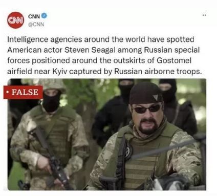 یک توییت تقلبی که ظاهراً از حساب‌رسمی توییتر شبکه سی ان ان منتشرشده است ادعا می‌کند استیون سیگال، بازیگر آمریکایی که ملیت دو کشور روسیه و آمریکا را دارد، در میان نیروهای ویژه روسیه و در نزدیک شهر کیف پایتخت اوکراین دیده‌شده است.