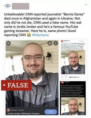 تصویر یک فعال یوتیوبی به نام جوردی جردن جعل شد و خبر جعلی کشته شدن او در اوکراین از حساب تقلبی سی ان ان منتشر شدپست او در توییتر، سی ان ان را متهم می‌کند که گزارشی از مرگ خبرنگاری به نام برنی گورز در اوکراین منتشر کرده است درحالی‌که سال گذشته در دورانی که طالبان افغانستان را دوباره در دست می‌گرفتند، خبر کشته شدن خبرنگاری دقیقاً با همین نام را منتشر کرده بود.